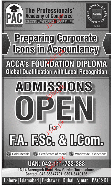 The Professionals Academy of Commerce Acca Foundation Diploma Global Qualification with Local Recognition Admission in FA, Fsc and I.Com in Lahore. For Contact 042-111-722-388 Read newspaper ad for exact details.