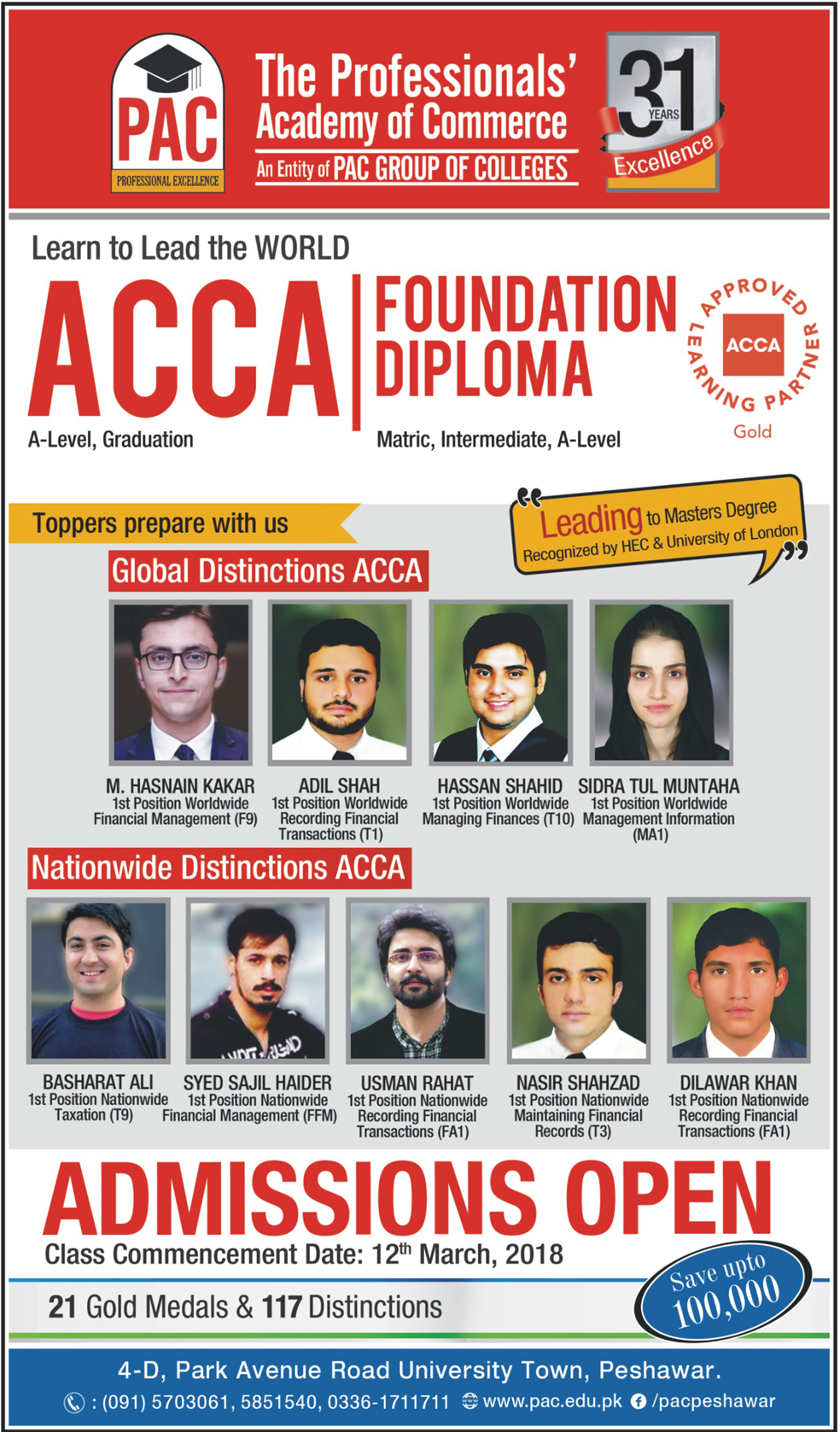 The Professionals Academy of Commerce Admission in ACCA Foundation Diploma in Peshawar. Class Commencement date is 12-03-2018. Leading to Master Degree. Read newspaper ad for exact details.
