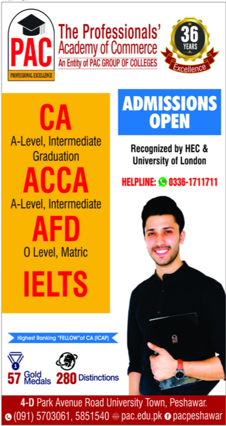 The Professionals Academy of Commerce CA, ACCA, AFD, IELTS. admissions 2022 has been started. Eligible students can apply for academic admissions 2022 in The Professionals Academy of Commerce Peshawar Khyber Pakhtunkhwa KPK Pakistan for Teaching College. Eligible students for fulfilling criteria for admissions in CA and ACCA can enroll as per Private admission policy 2022 till closing date 15 September 2022. Read newspaper ad for exact details.