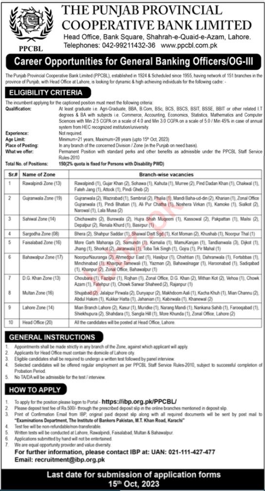 The Punjab Provincial Cooperative Bank Limited invites applications for job positions advertised in daily Jang dated 1 October 2023 for following vacancies in Lahore, lahore, sahiwal, sargodha, dera ghazi khan, gujranwala, faisalabad, rawalpindi, multan and bahawalpur Punjab Pakistan.
