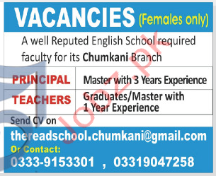 The Read School, Chumkani, Peshawar is looking for the following qualified and experienced staff. Principal, Math Teacher, Physics Teacher, Chemistry Teacher, Biology Teacher, English Teacher, Urdu Teacher, Pak Studies Teacher, Islamic Studies Teacher, Montessori Teacher