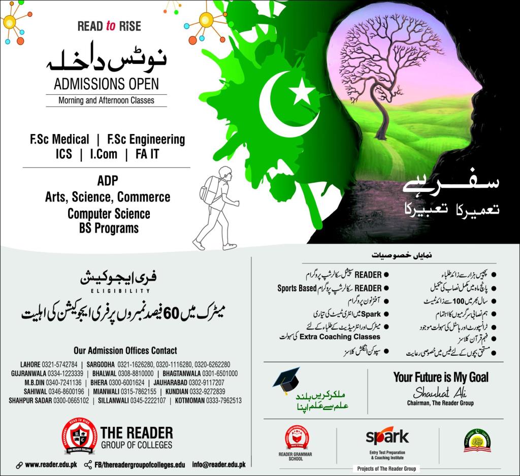 The Reader Group of Colleges Faculty of Science Pre-Engineering, Pre-Meidal, ICS, I.Com, Faculty of Arts Information Technology, ADP Arts, Sciences, Commerce, Computer Sciences, BS Programs. admissions 2022 has been started. Students can enroll for admissions in The Reader Group of Colleges Islamabad Islamabad Pakistan for academic year 2022 to continue campus based or online education in Teaching College. Students for admissions in I.com, Intermediate, Bachelor, ADP, BS and ICS can apply for online or campus classes as per Private institute criteria till admission closing date September 30, 2022. Read newspaper ad for exact details.