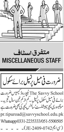 The Savvy School jobs advertisement dated about 22 October 2024 in daily Jang Newspaper invites application for the vacant post of montessori teacher, teacher, principal, female principal and science teacher in Rawalpindi, rawalpindi Punjab Pakistan. Candidates with Bachelor and Master etc. educational background will be preferred.