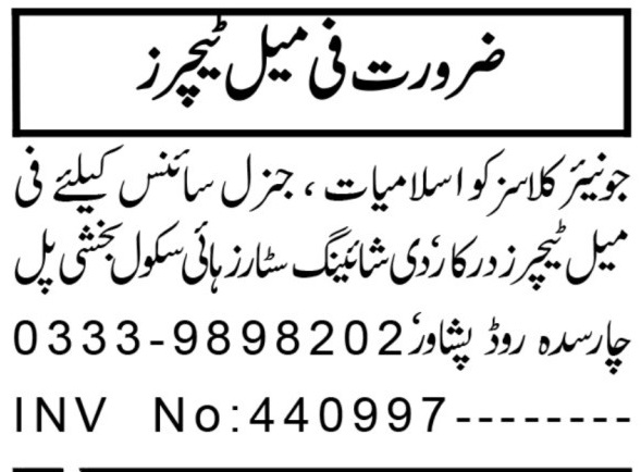 The Shining Stars High School jobs advertisement dated about 26 April 2025 in daily Aaj Newspaper invites application for the vacant post of teacher, general science teacher, female teacher and islamiat teacher in Charsadda Road Peshawar, peshawar Khyber Pakhtunkhwa KPK Pakistan. Persons with Master and Bachelor etc. education can apply.
