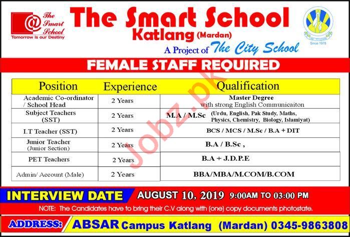 The Smart School Katlang Mardan KPK requires the services of qualified and well educated female candidates for the positions of Academic Coordinator, School Head, Urdu Teacher, Subject Teacher, English Teacher Pak Study Teacher, Math Teacher, Physics Teacher, Chemistry Teacher, Biology Teacher, Islamiyat Teacher, IT Teacher, PET Teacher, Admin Officer, Account Officer.