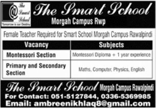 The Smart School jobs advertisement dated about 17 February 2025 in daily Jang Newspaper invites application for the vacant post of primary teacher, teacher, secondary teacher and montessori section head in Morgah Rawalpindi, rawalpindi Punjab Pakistan. Educational qualifications required Bachelor and Master etc.