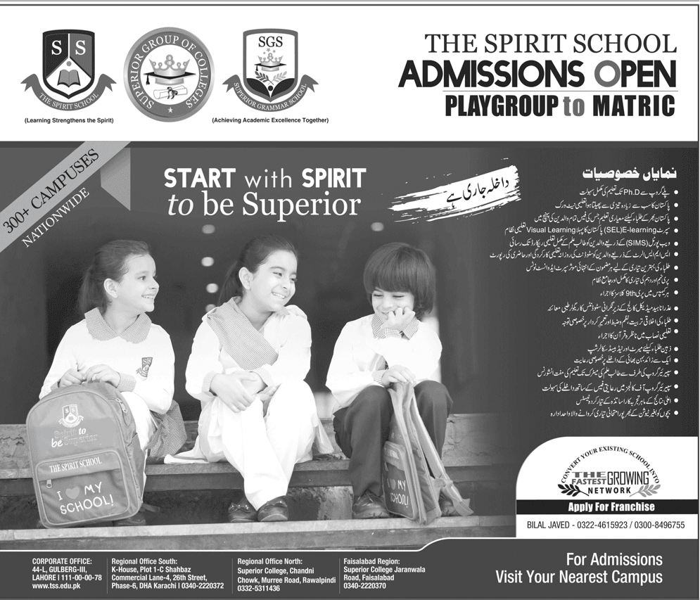 The Spirit School Admission in Playgroup to Matric in Faisalabad / Lahore / Karachi / Rawalpindi / Jhranwala. For Admission and more Detail visit nearest Campus. Read newspaper ad for exact details.
