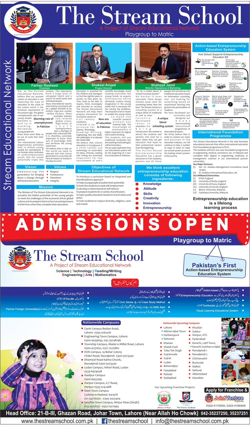 The Stream School Admission in Playgroup to Matric in Lahore. Admission Session 2018-2019. Registration open. Admission Open for Both Male / Female Students Read newspaper ad for exact details.
