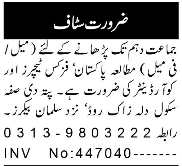 The Suffah School Dalazak Road Peshawar, peshawar Khyber Pakhtunkhwa KPK Pakistan invites applications from eligible candidates for the post of coordinator, female teacher, teacher, pakistan study teacher and physics teacher as per advertisement of November 13, 2025 published in daily Aaj Newspaper. Persons with Bachelor and Master etc. education can apply.
