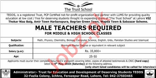 The Trust School Lahore Jobs 2018 For Male Teachers