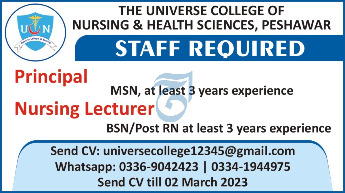 The Universe College of Nursing & Health Science invites applications for job positions advertised in daily Aaj dated 22 February 2023 for following vacancies in Peshawar, peshawar Khyber Pakhtunkhwa KPK Pakistan.