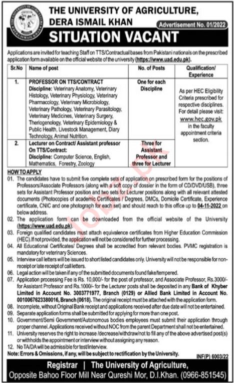 The University Of Agriculture invites applications for job positions advertised in daily Ausaf dated 17 October 2022 for following vacancies in Dera Ismail Khan, dera ismail khan Khyber Pakhtunkhwa KPK Pakistan.