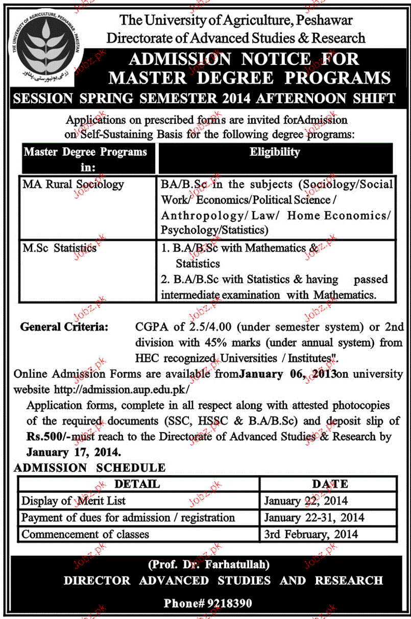 The University of Agriculture Peshawar Admission in MA Sociology in Peshawar Read newspaper ad for exact details.