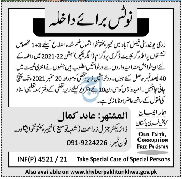 The University Of Agriculture is a public sector university invites applications for admissions in Undergraduate Degree Program Agriculture in Peshawar Khyber Pakhtunkhwa KPK 2021. Read newspaper ad for exact details.
