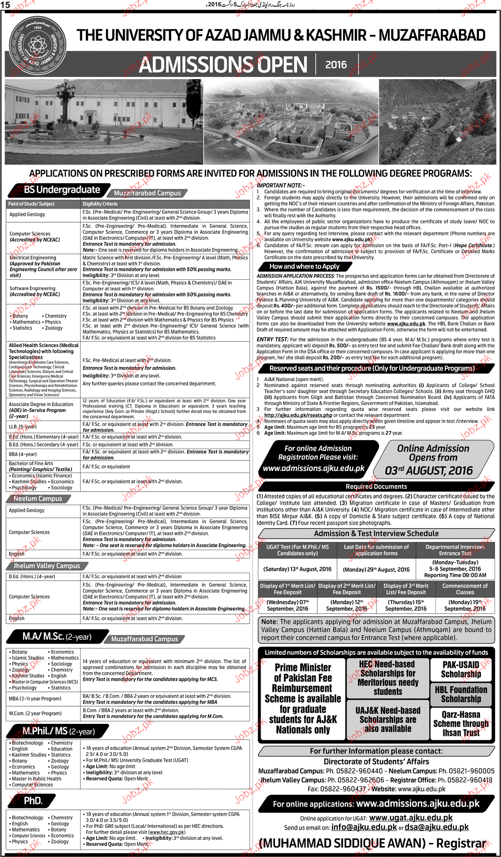 The University of Azad Jammu & Kashmir Admission in Undergraduate Programs in Muzaffarabad. Read newspaper ad for exact details.