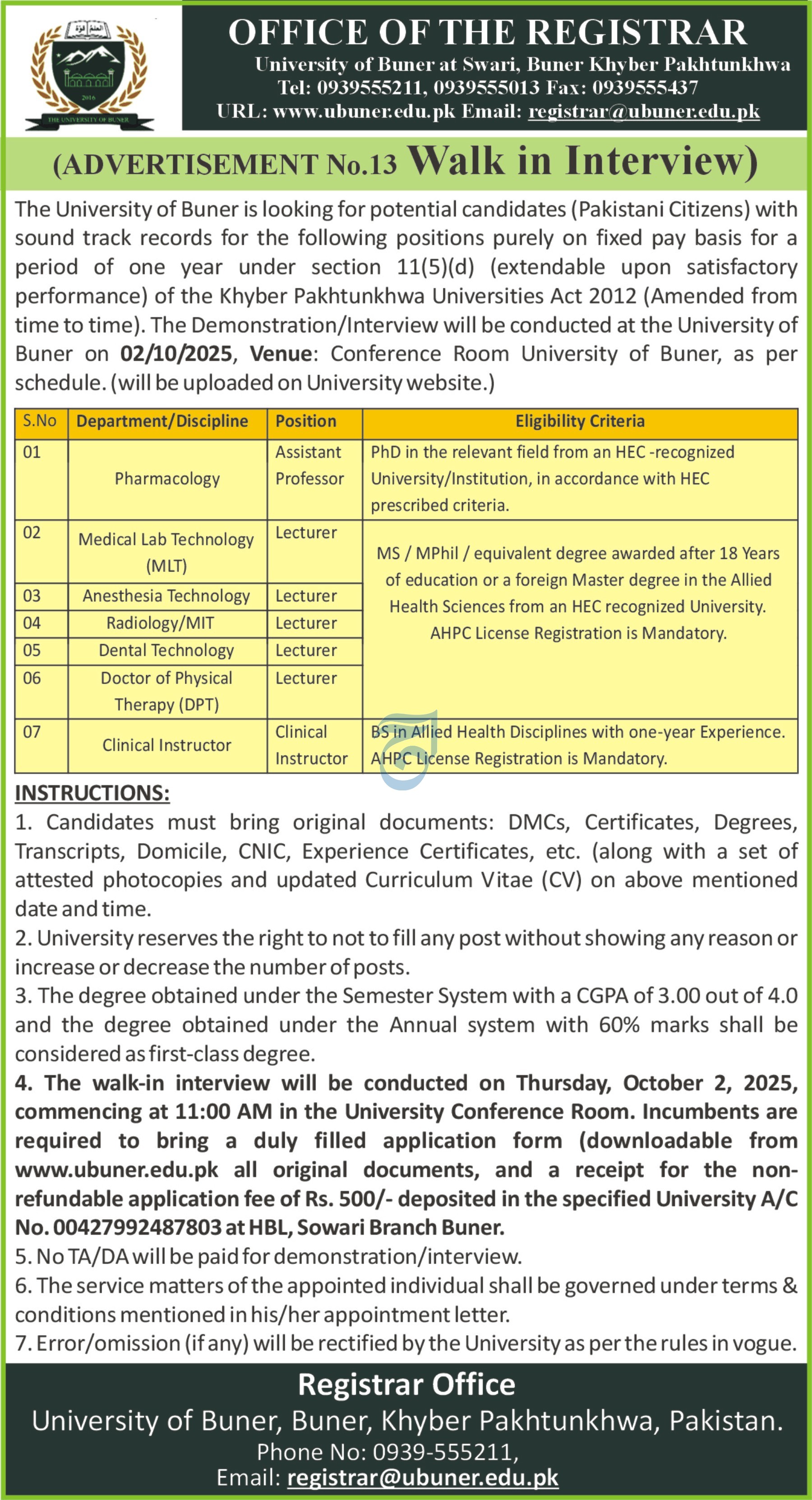 Vacant posts including lecturer, clinical instructor and assistant professor are announced in The University of Buner Buner, buner Khyber Pakhtunkhwa KPK Pakistan as per 26 September 2025 advertisement in daily Aaj Newspaper. Master, Mphil, Bachelor and Phd etc. educational qualification will be preferred.