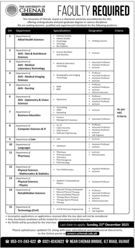 The University of Chenab invites applications for job positions advertised in daily Jang dated 7 December 2025 for following vacancies in G.T Road Gujrat, gujrat Punjab Pakistan.