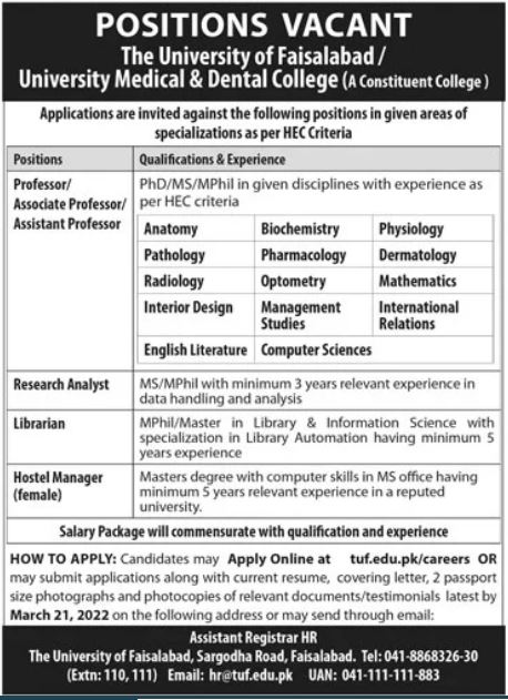 Vacant posts including associate professor, research analyst, hosten manager, professor, assistant professor and librarian are announced in The University of Faisalabad Faisalabad, faisalabad Punjab Pakistan as per 16 March 2022 advertisement in daily Jang Newspaper. Educational qualifications required Master, Mphil, Phd and MS etc.