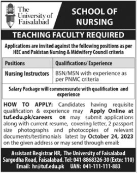 Vacant posts including nursing instructor are announced in The University of Faisalabad Faisalabad, faisalabad Punjab Pakistan as per 16 October 2023 advertisement in daily Jang Newspaper. MS, Master and Bachelor etc. educational qualification will be preferred.