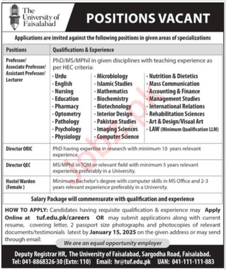 Vacancies in The University of Faisalabad Advertisement January 2025