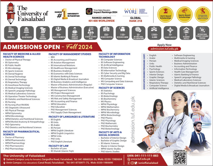 The University of Faisalabad Faculty of Medicine & Allied Health Sciences, Faculty of Management Studies, Faculty of Information Technology admissions 2024 has been started. Eligible students who qualify as per admission criteria in The University of Faisalabad Faisalabad Punjab Pakistan can apply in Teaching University for academic year 2024. Students for admissions in MBA, MS, Mphil, Phd, BBA, BS, DPT and Pharm D & criteria can apply as per Private institute admission policy 2024 before closing date September 20, 2024 as per advertisement. Read newspaper ad for exact details.