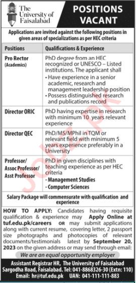 Vacancies in The University of Faisalabad Advertisement September 2023