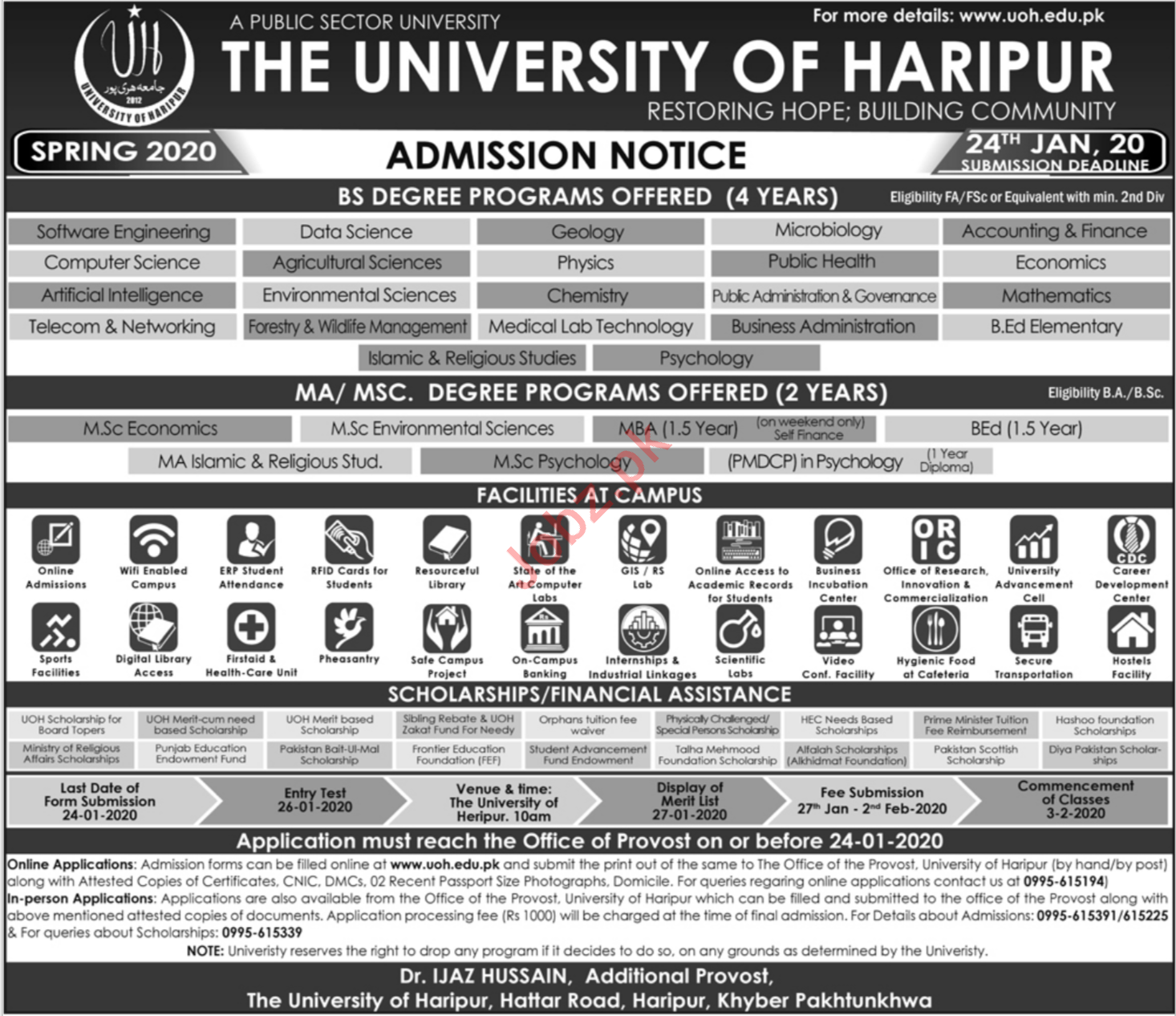 The University of Haripur is a public university has announced admissions for 4 Years BS Degree Programs, MA & MSc 2 Years Degree Programs in Haripur Khyber Paktunkhwa KPK 2020. Read newspaper ad for exact details.
