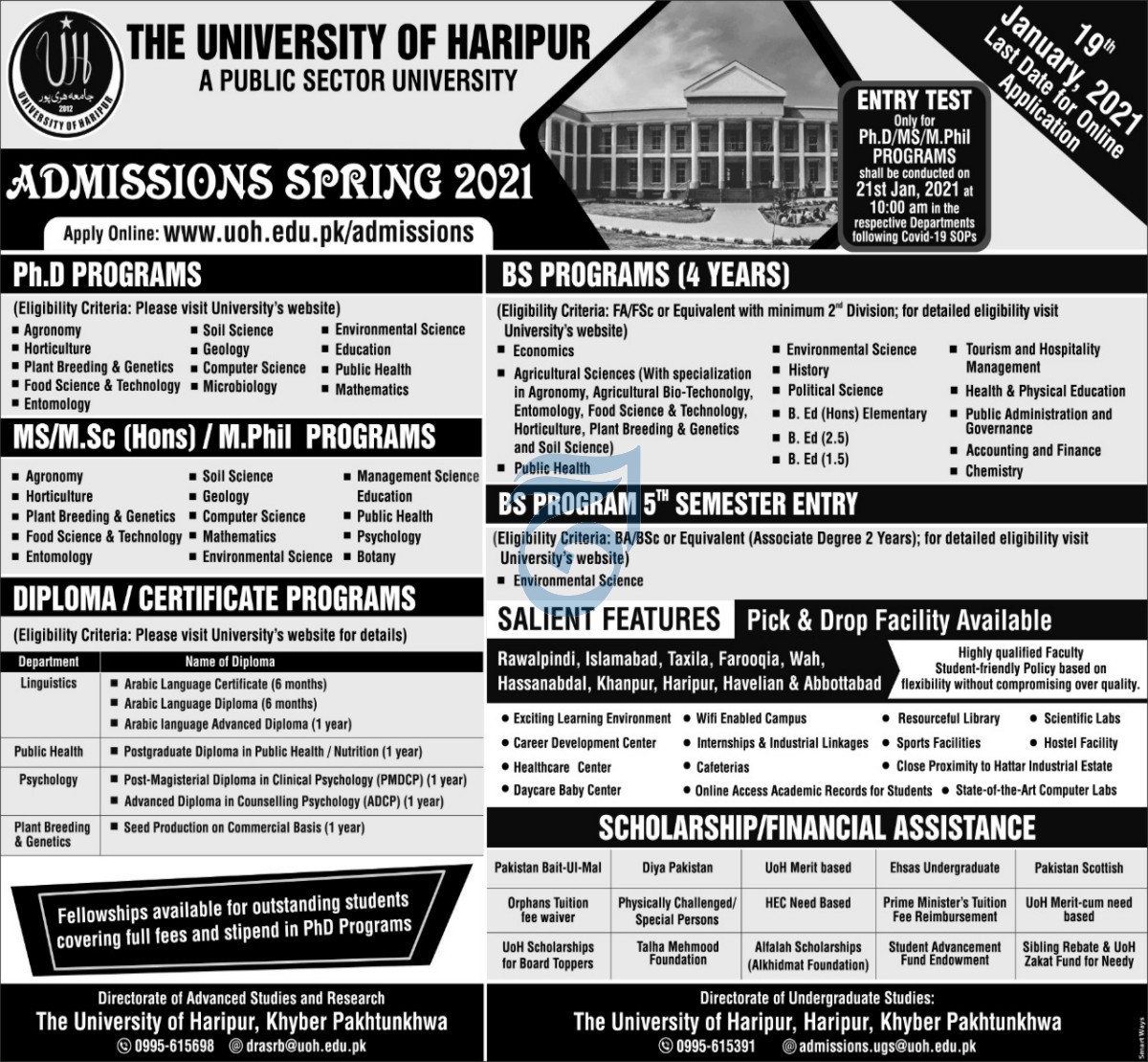 The University of Haripur UOH is a public sector university invites applications for online admissions in PhD, BS, MS, MSc Hons and M.Phil degree programs 2021. Read newspaper ad for exact details.