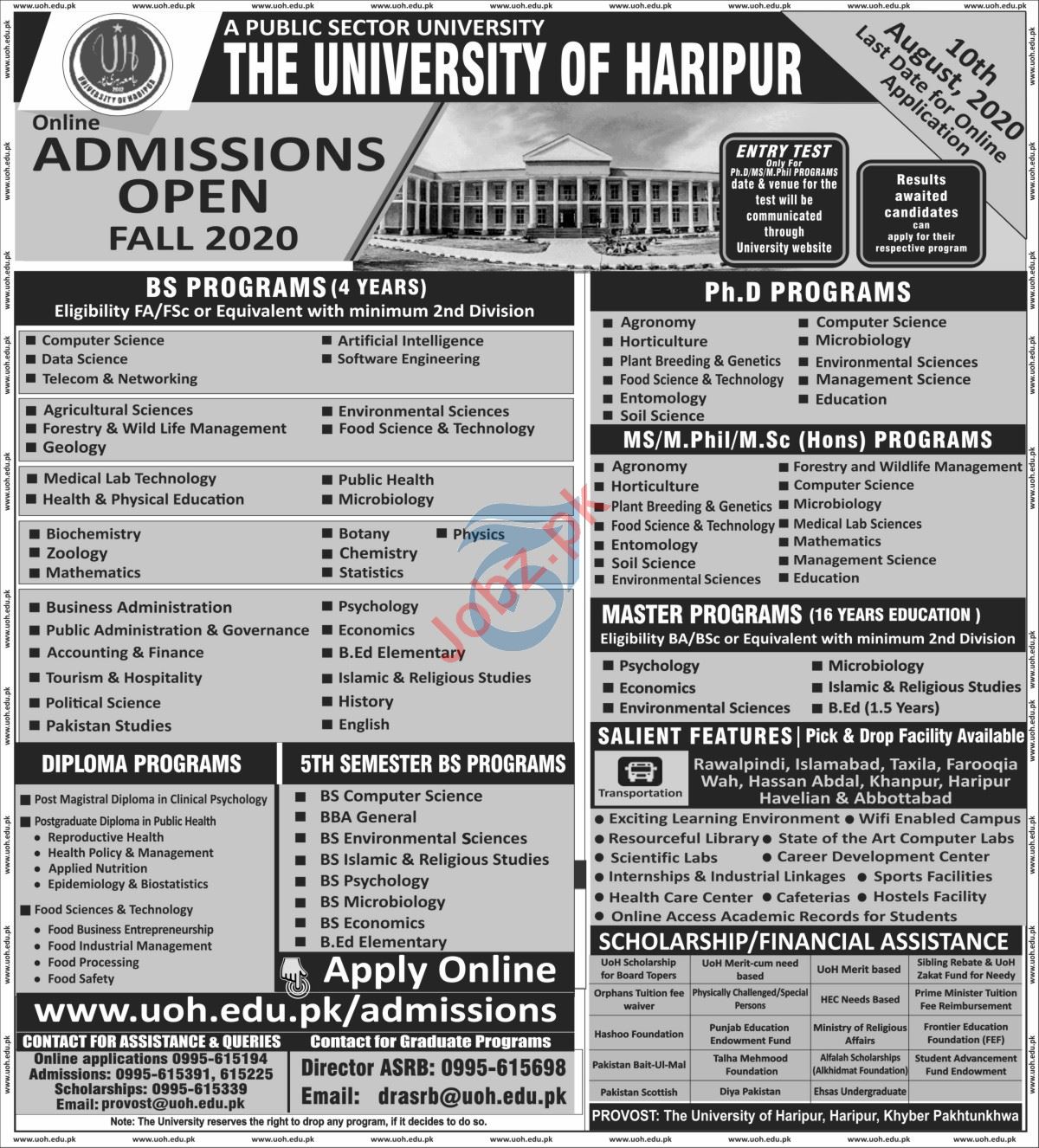 The University of Haripur UOH, Pakistan is starting admissions fall 2020 for the classes of BS, BEd, BBA, MS, M Phil, M Sc Hons & PhD in Agronomy, Horticulture, Entomology and Education. Read newspaper ad for exact details.