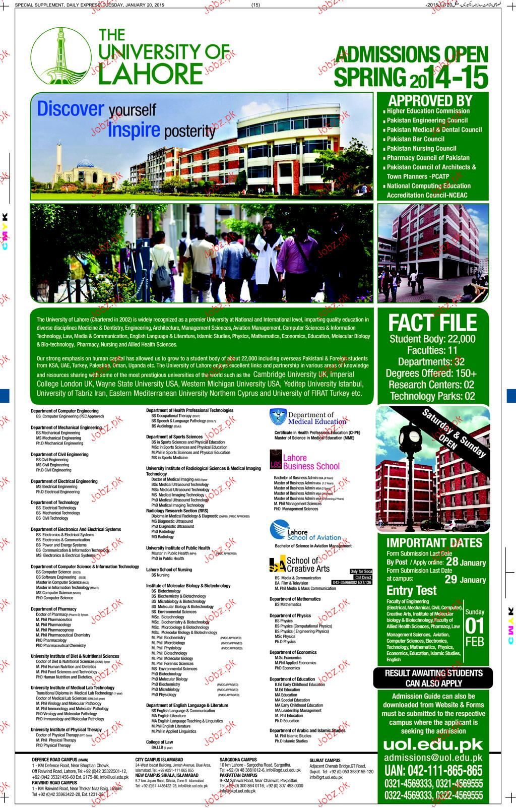 The University of Lahore Admission in BBA, MBA and DPT in Lahore. Read newspaper ad for exact details.