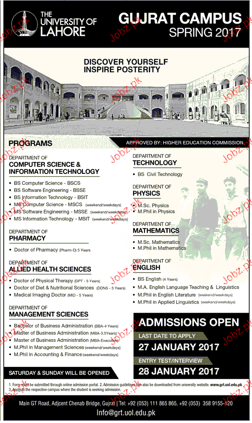 The University of Lahore Admission in BS in Gujrat. Read newspaper ad for exact details.