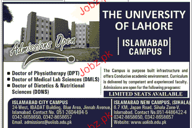 The University of Lahore Admission in DPT, dmls and DDNS in lahore. Read newspaper ad for exact details.