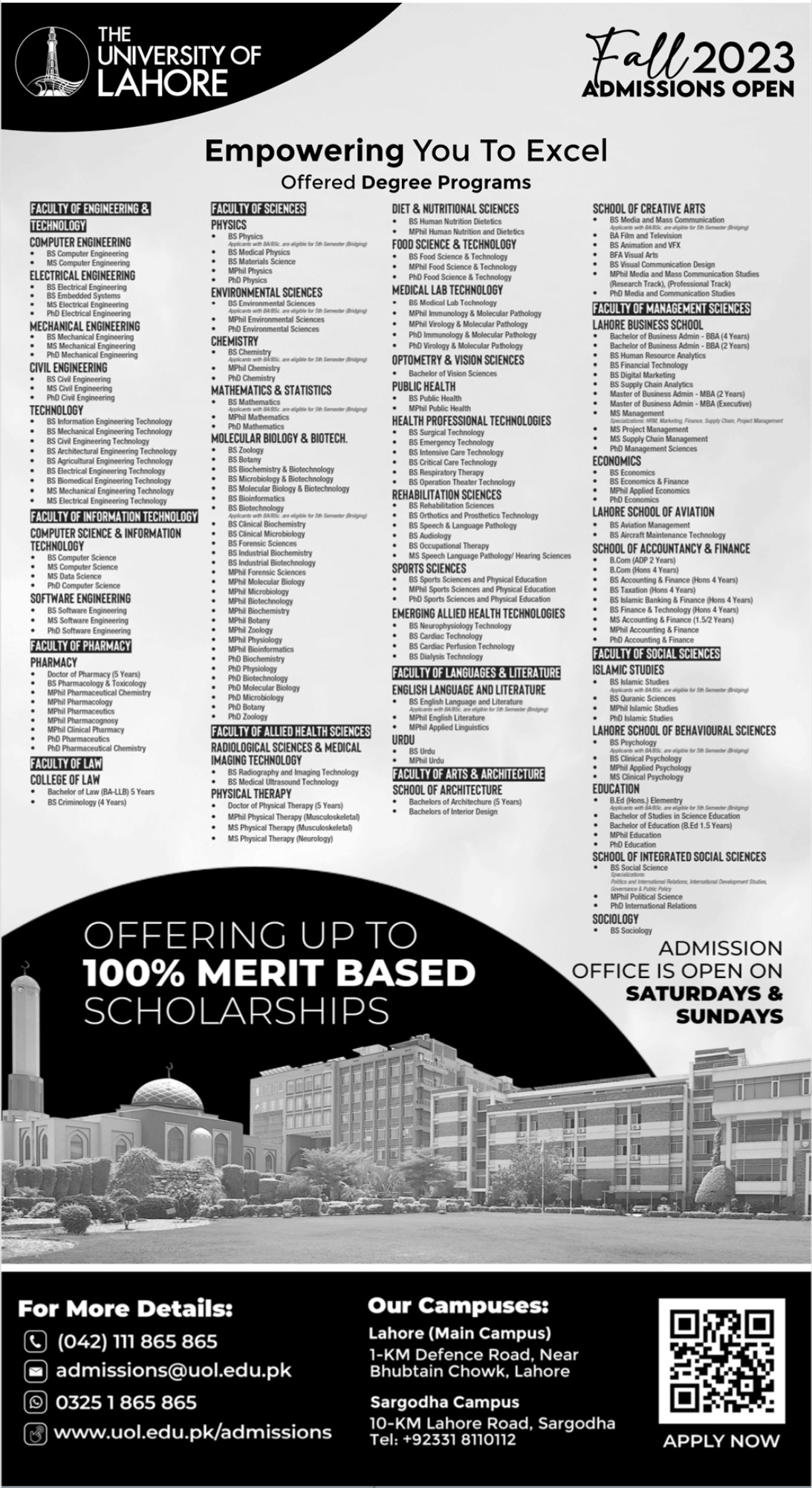 The University of Lahore has announced admissions 2023 for BS, MS, MPhil, BBA, D Pharm, PhD. Eligible students who qualify as per admission criteria in The University of Lahore Lahore Sargodha Punjab Pakistan can apply in Science University for academic year 2023. Students for admissions in MS, Mphil, BS, Pharm D and BBA & criteria can apply as per Private institute admission policy 2023 before closing date August 7, 2023 as per advertisement. Read newspaper ad for exact details.