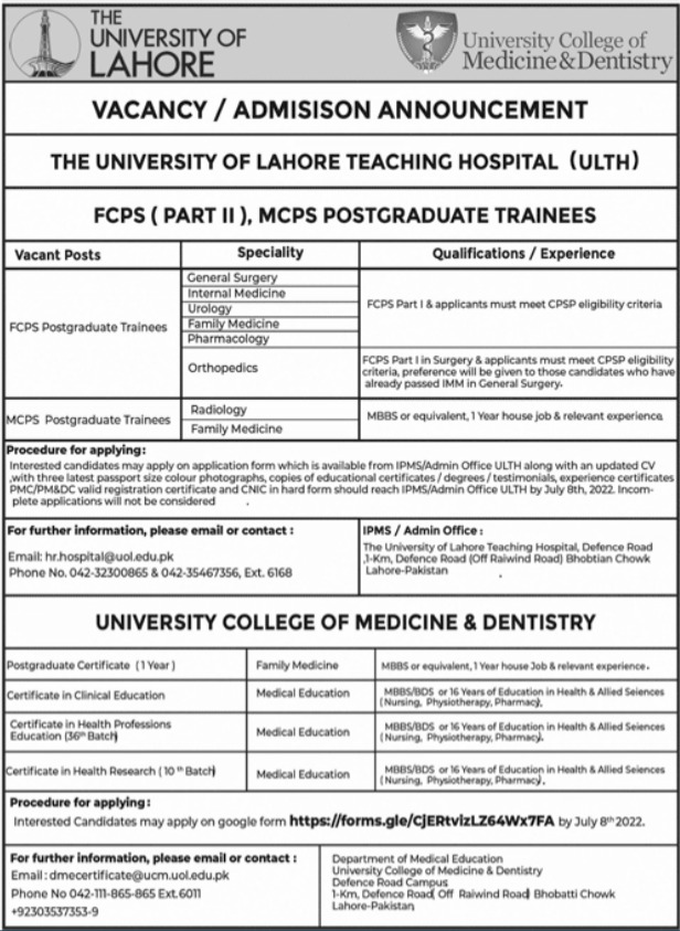 The University of Lahore Lahore, lahore Punjab Pakistan invites applications from eligible candidates for the post of FCPSpostgraduate Trainee, Postgraduate Family Medicine Trainee, MCPSRadiology Trainee, FCPSFamily Medicine Trainee, FCPSPharmacology Trainee, FCPSGeneral Surgery Trainee, MCPSFamily Medicine Trainee, FCPSOrthopedics Trainee, FCPSpart II Trainee, FCPSUrology Trainee, MCPS Postgraduate Trainee and FCPSInternal Medicine Trainee as per advertisement of July 3, 2022 published in daily Jang Newspaper. Persons with Others etc. education can apply.