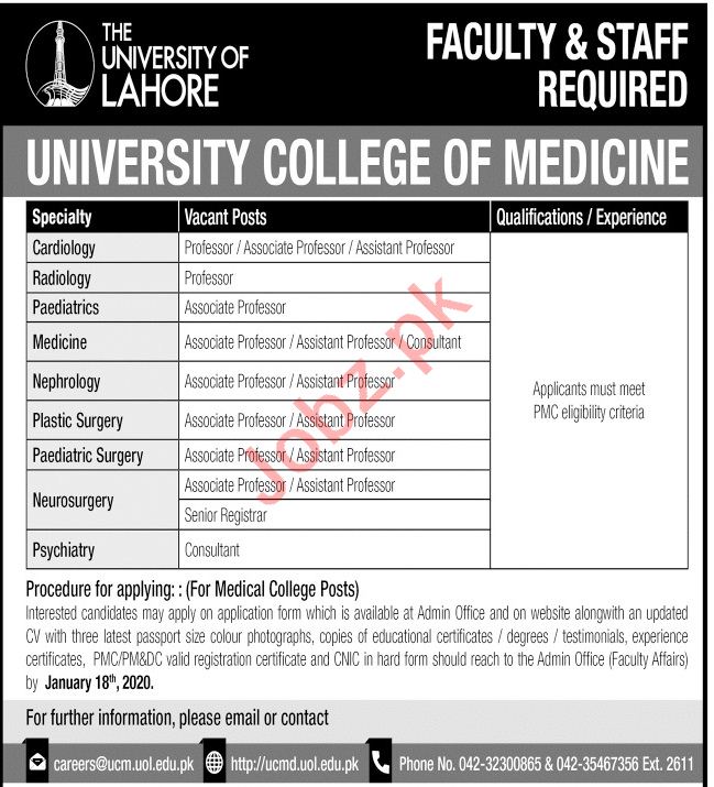 The University of Lahore, University College of Medicine invites applications from medical, mbbs, hardworking and well qualified candidates against the posts of Professor, Associate Professor, Assistant Professor, Registrar, Consultant Cardiology, Radiology, Paediatrics, Medicine, Nephrology, Plastic Surgery, Psychiatry in Lahore.