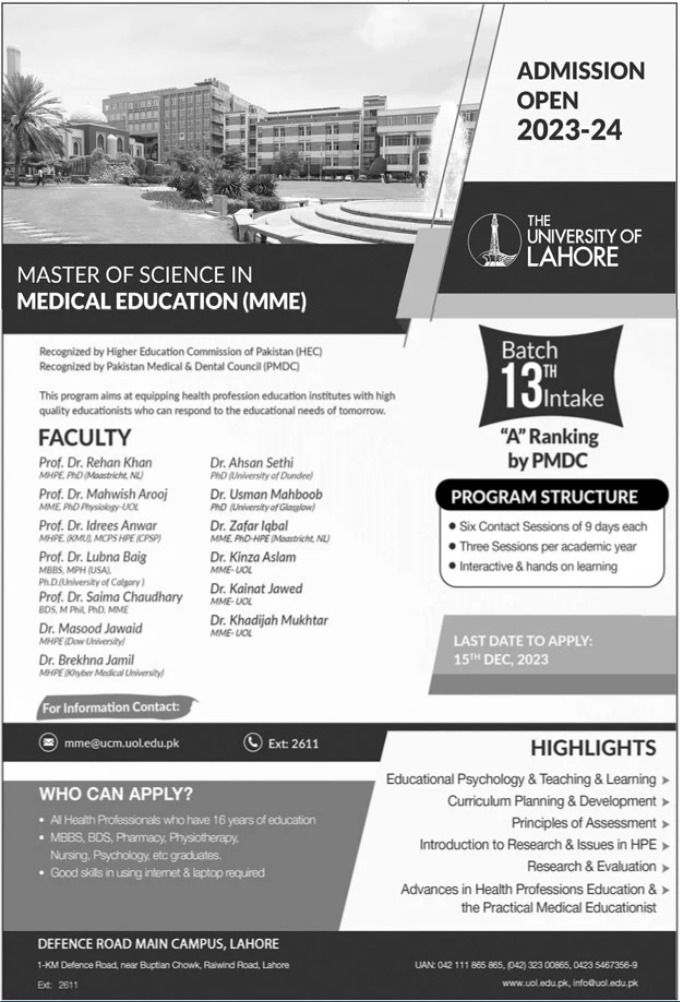 Admissions in The University of Lahore UOL 2023 for Masters of Science in Medical Education, MME has been announced. The University of Lahore UOL Lahore Punjab Pakistan welcomes students to apply for admissions in academic year 2023 in Medical University. Students for admissions in Master & criteria can apply as per Private institute admission policy 2023 before closing date December 15, 2023 as per advertisement. Read newspaper ad for exact details.