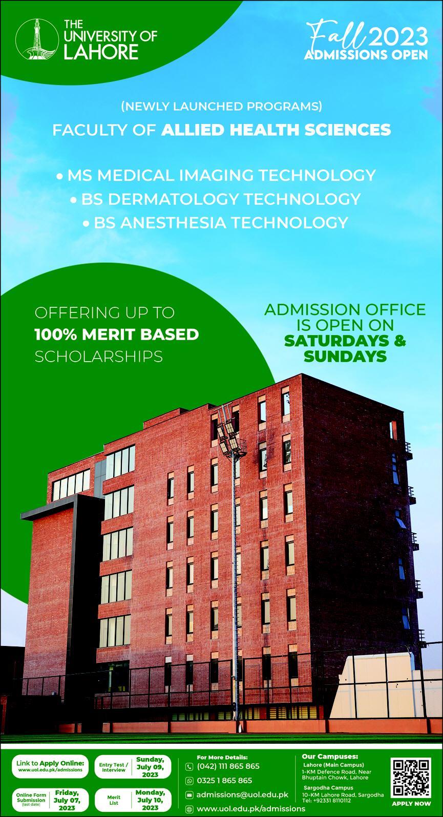 The University of Lahore BS Degree in Dermatology Technology, Anesthesia Technology, MS in Imaging Technology admissions 2023 has been announced. The University of Lahore Lahore Punjab Pakistan welcomes students to apply for admissions in academic year 2023 in Medical University. Eligible candidates for admissions in BS and MS can apply as per Private institute criteria and before closing date 7 July 2023 after reading advertisement online. Read newspaper ad for exact details.