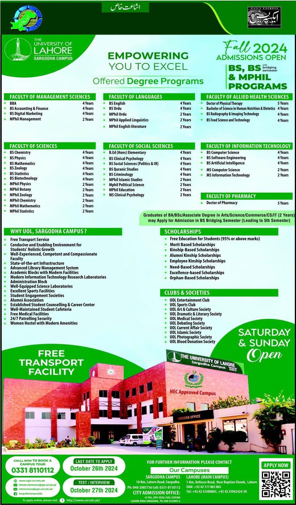 The University of Lahore BS, BBA, MPhil admissions 2024 has been started. Eligible students who qualify as per admission criteria in The University of Lahore Lahore Punjab Pakistan can apply in Science University for academic year 2024. Students for admissions in B.ed, BS, Mphil and BBA & criteria can apply as per Government institute admission policy 2024 before closing date October 25, 2024 as per advertisement. Read newspaper ad for exact details.