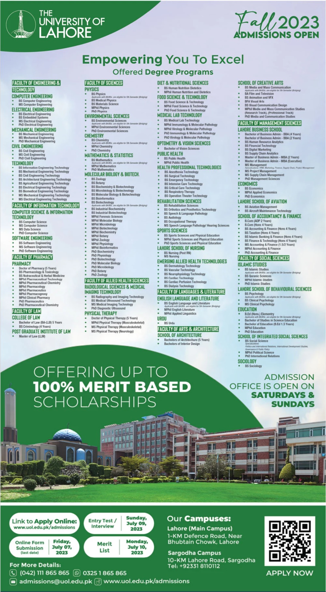 The University of Lahore BS, MS, MPhil, PhD, Pharm D, LLB, DPT admissions 2023 has been started. Students who want to take admissions in The University of Lahore Lahore Punjab Pakistan for academic year 2023 to continue education in Science University can apply. Students for admissions in DPT, Phd, P.G Diploma, MS, Pharm D, LLb, BS, MBA, Mphil and BBA & criteria can apply as per Private institute admission policy 2023 before closing date July 07, 2023 as per advertisement. Read newspaper ad for exact details.
