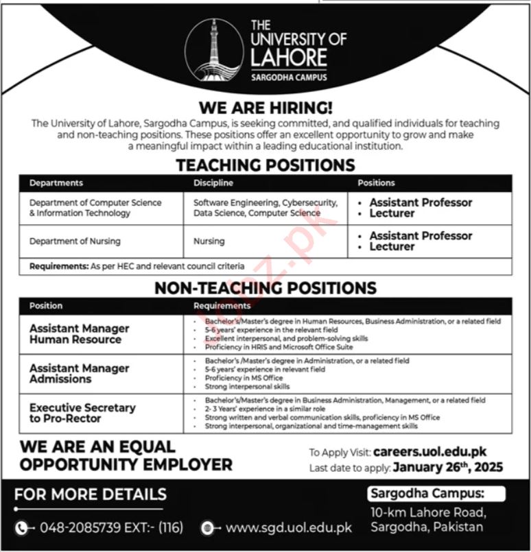 The University of Lahore jobs advertisement dated about 12 January 2025 in daily Jang Newspaper invites application for the vacant post of lecturer, assistant manager admissions, assistant manager human resource, executive secretary to pro rector and assistant professor in Sargodha, sargodha Punjab Pakistan. Educational qualifications required Master, Bachelor, Phd, MS and Mphil etc.
