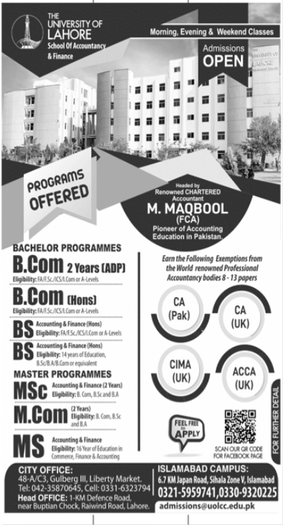 The University of Lahore UOL School of Accountancy & Finance has announced admissions in B-Com, B-Com Hons, BS, MSc, M-Com and MS in Lahore Campus Punjab. Read newspaper ad for exact details.