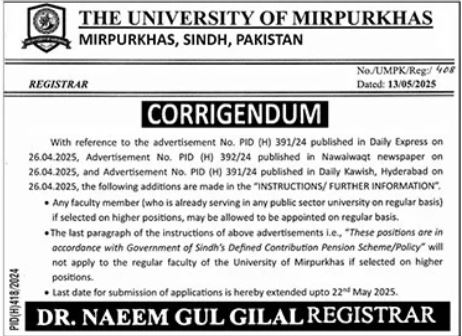 The University of Mirpurkhas latest Government Management jobs and others can be applied till 22 May 2025 or as per closing date in newspaper ad. Read complete ad online to know how to apply on latest The University of Mirpurkhas job opportunities.
