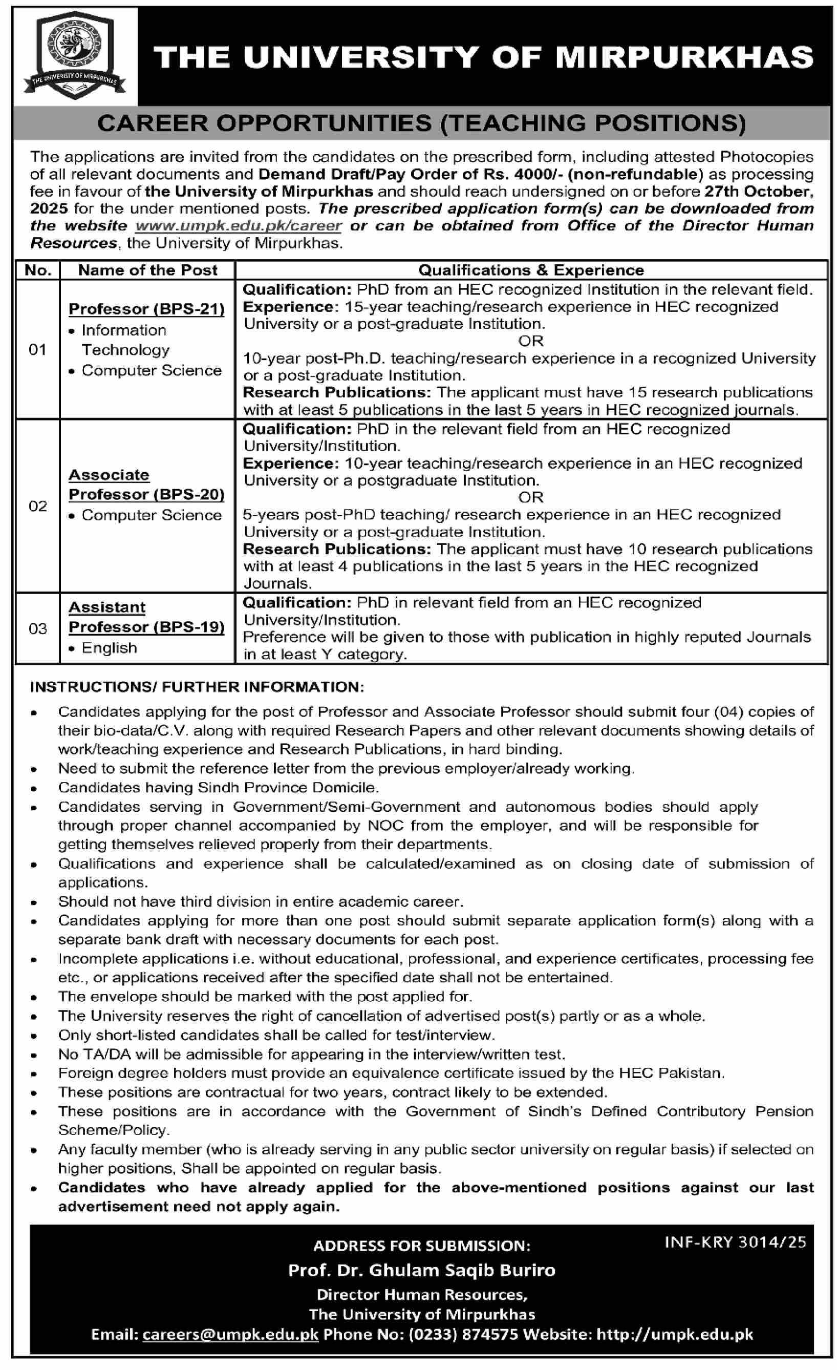 Vacancies in The University of Mirpurkhas Advertisement September 2025