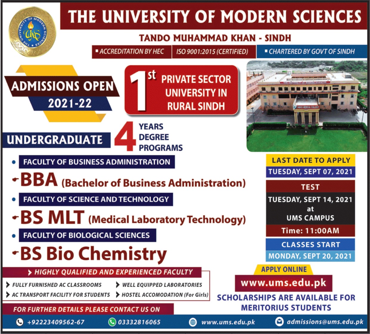 The University of Modern Sciences is a private sector university invites applications for admissions in Bachelor of Business Administration BBA, BS Medical Laboratory Technology MLT & BS Bio Chemistry in Tando Muhammad Khan Sindh Pakistan 2021. Read newspaper ad for exact details.