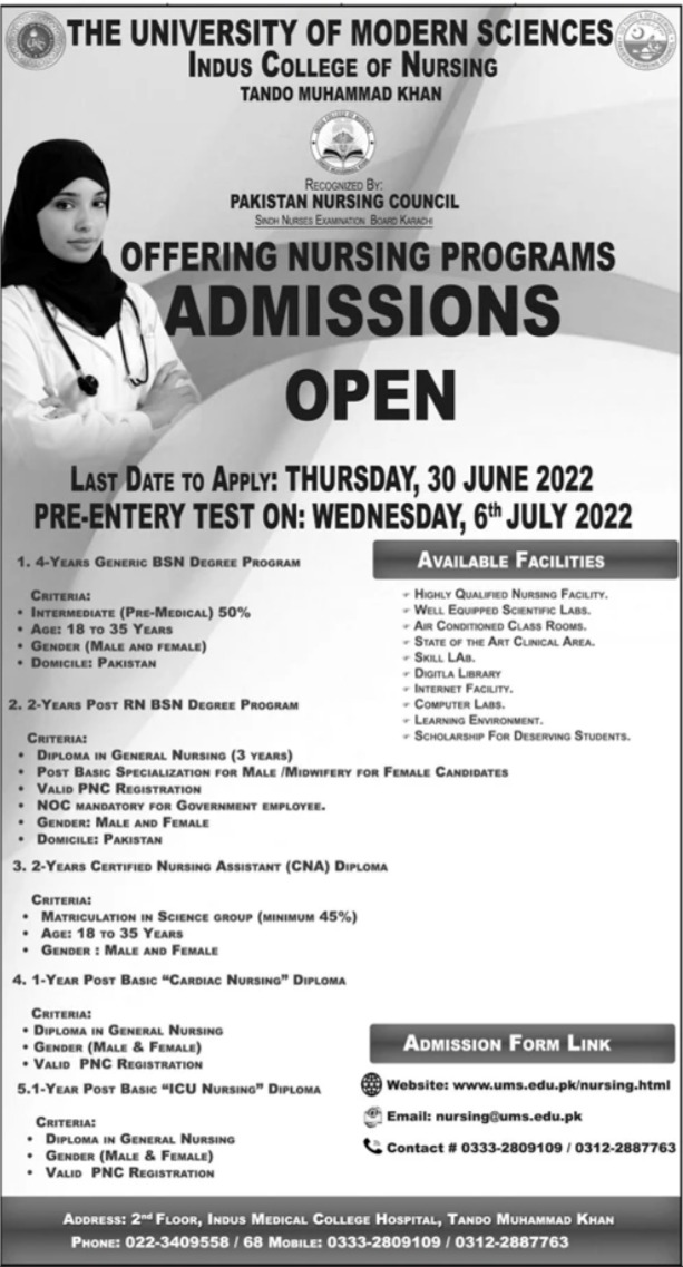 The University of Modern Sciences, Indus College of Nursing Recognized by Pakistan Nursing Council PNC BSN, 4 Years Generic BSN Degree Program, 2 Years Post RN BSN Degree Program, 2Years Certified Nursing Assistant CNA Diploma, 1 Year Post RN Basic Cardiac Nursing Diploma, 1 Year Post RN Basic ICU Nursing Diploma, admissions 2022 has been started. Eligible students can apply for academic admissions 2022 in The University of Modern Sciences Hyderabad Sindh Pakistan for Medical Medical College. Eligible students for fulfilling criteria for admissions in Course, Diploma and BSN can enroll as per Private admission policy 2022 till closing date 6 July 2022. Read newspaper ad for exact details.
