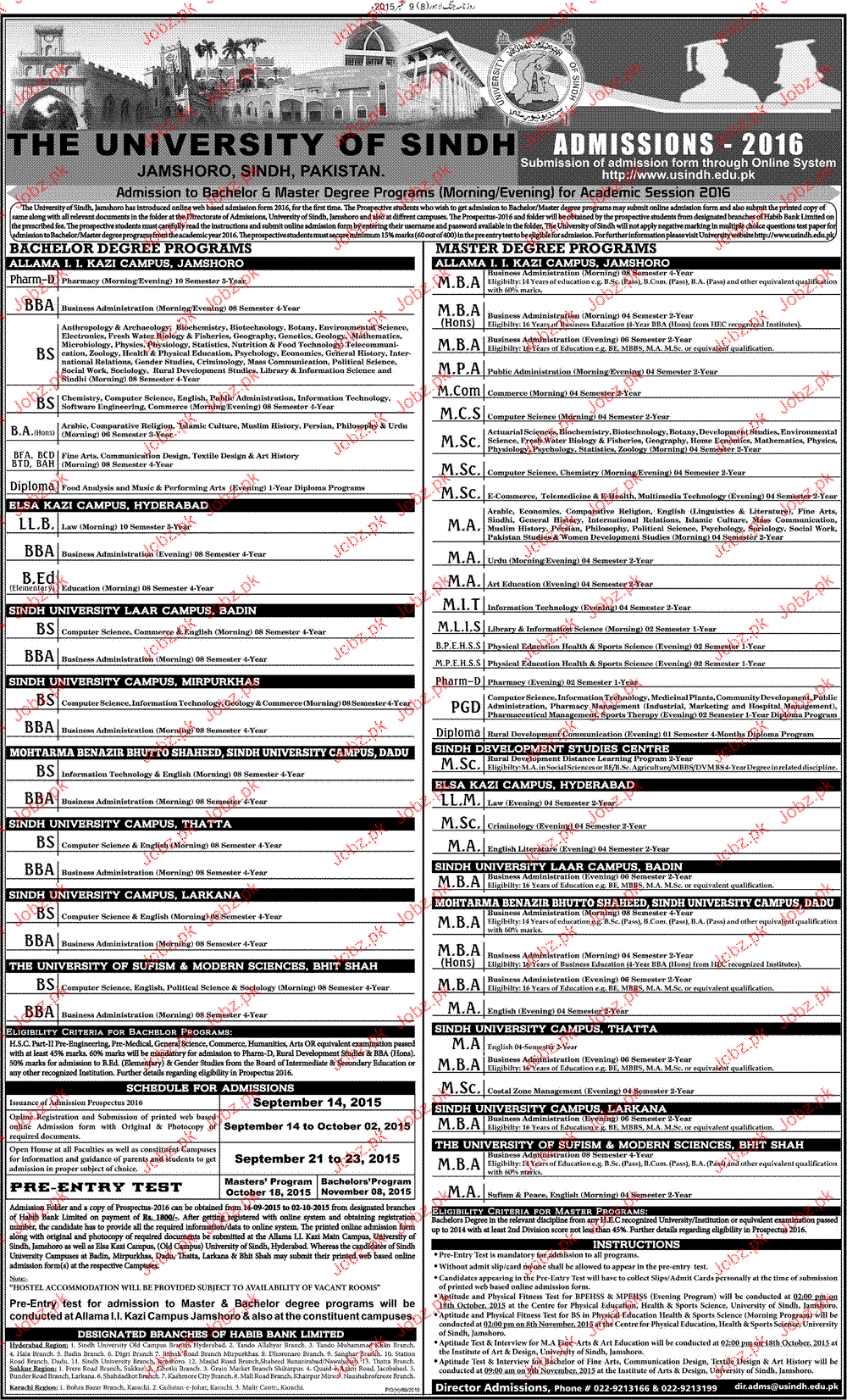 The University of Sindh Admission in BBA, BS, BA, MCs and MA in Jamshoro. Read newspaper ad for exact details.