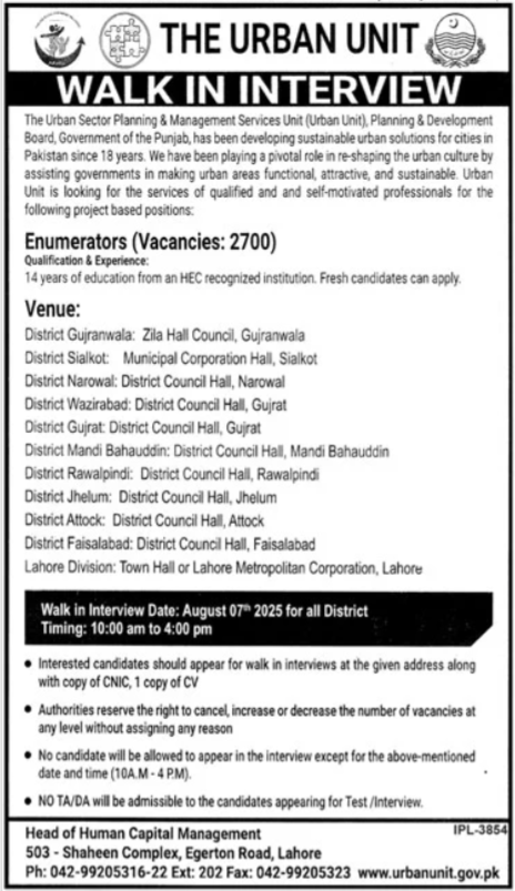 Vacant posts including enumerator are announced in The Urban Unit Egerton Road Lahore, lahore Punjab Pakistan as per 2 August 2025 advertisement in daily Jang Newspaper. Persons with Bachelor etc. education can apply.