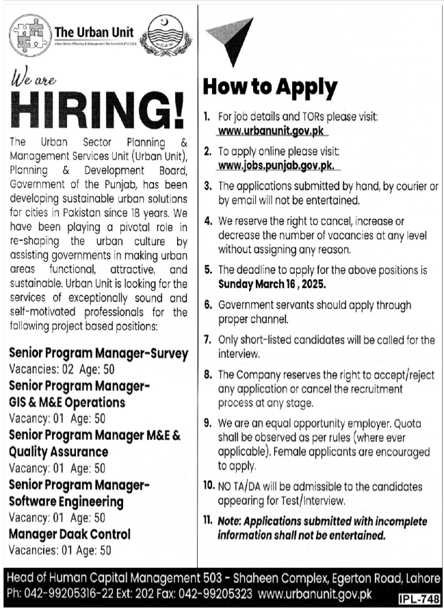 The Urban Unit Egerton Road Lahore, lahore Punjab Pakistan invites applications from eligible candidates for the post of program manager, program manager software engineering, program manager gis, program manager survey, m&e operations manager, program manager m&e, manager daak control and program manager quality assurance as per advertisement of February 26, 2025 published in daily Express Tribune Newspaper. Educational qualifications required Bachelor and Master etc.