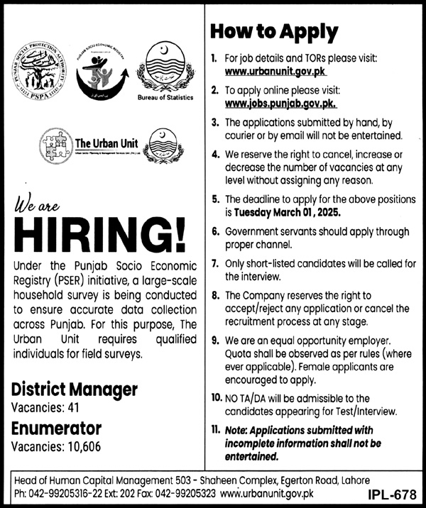The Urban Unit invites applications for job positions advertised in daily Nation dated 19 February 2025 for following vacancies in Egerton Road Lahore, lahore Punjab Pakistan.