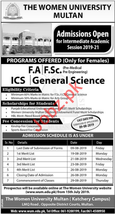 The Woman University Multan, Pakistan are starting admissions fall 2019 for the classes of F Sc in Pre Medical and Pre Engineering, ICS, I Com, FA General Sciences. Read newspaper ad for exact details.